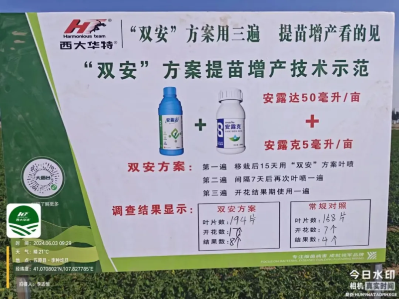 在观摩会现场,李志恒经理精心设置了实验组和对照组,通过随机拔取的方式,对两组秧子的叶片数、开花数、结果数进行了详细的调查与对比。结果显示,使用安露达的实验组秧子在叶片数、开花数和结果数上均显著优于对照组,其中叶片数差异达到36片,开花数差异为10个,结果数差异为4个。这一数据让在场的农户们惊叹不已,纷纷表示要学习和使用安露达产品,提升自家农作物的产量和品质。