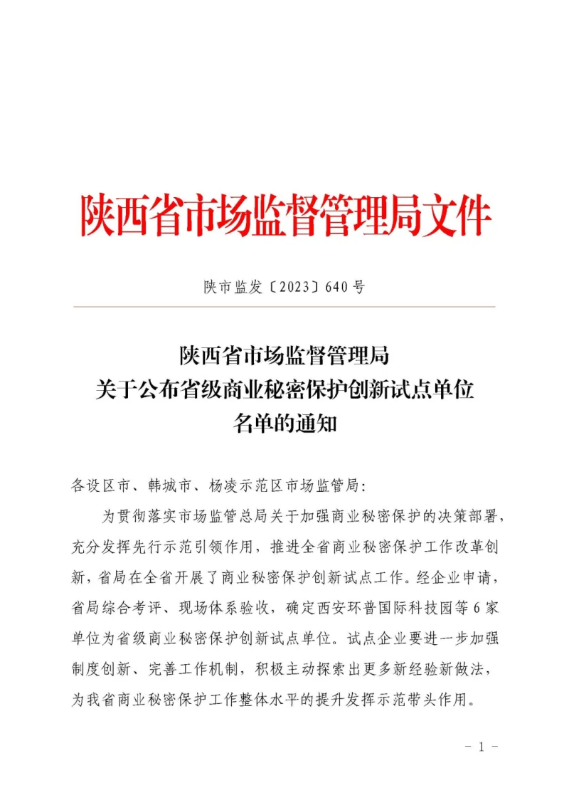 近日,经过陕西省市场监督管理局综合考评和现场体系验收,西安环普国际科技园正式被认定为“省级商业秘密保护创新试点单位”。这一荣誉不仅是对我们保密工作的肯定,更是对我们不断探索、创新商业秘密保护模式的认可。西安环普将一如既往地坚守保密职责,为保护商业秘密、促进公平竞争、推动经济高质量发展贡献力量。