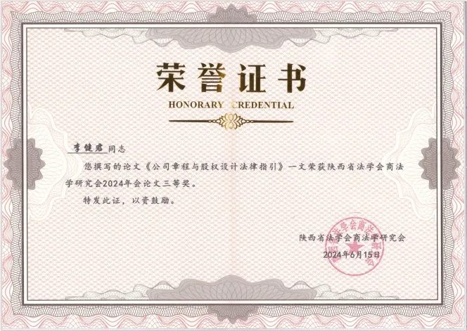 李健君主任常年在公司章程与股权设计法律中不断深入专研《公司法》,用自己专业的法律知识为企业提供专业的法律指导,从而荣获更多法律经验,并根据自己实践以及法律知识撰写《公司章程与股权设计法律指引》,从而在2024年参选陕西省法学会商法学研究会论文评选中,荣获陕西省法学会商法学研究会2024年会论文三等奖。