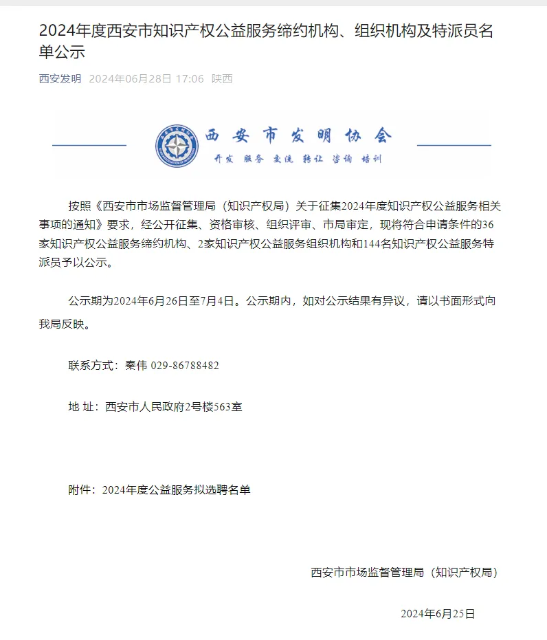 为进一步强化知识产权公共服务供给和保障,促进西安科创企业创新发展,不断优化营商环境,2024年6月25日,西安市市场监督管理局(知识产权局)发布了2024年度西安市知识产权公益服务缔约机构、组织机构及特派员名单,公示期已满。