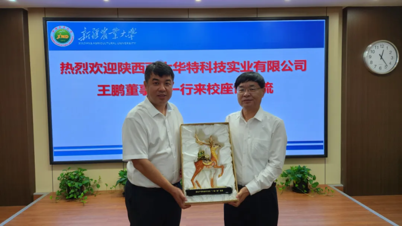 2024年8月20日,陕西西大华特科技实业有限公司董事长王鹏一行前往新疆农业大学拜访新疆农业大学校长蒋平安,双方就产学研合作、人才培养、“一带一路”农业合作等议题进行了深入交流与探讨。