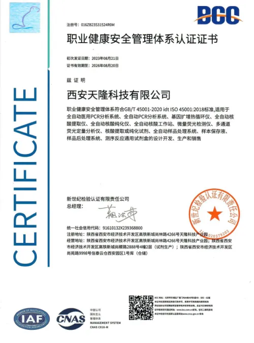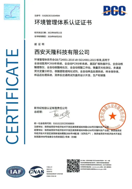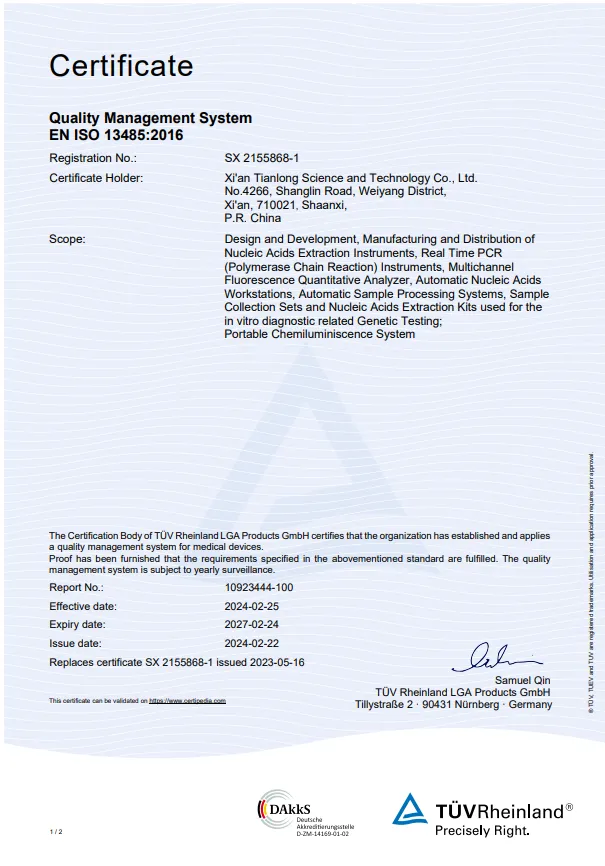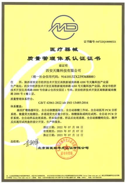 产品、服务的质量与安全,事关用户生命健康。凭借规范化的生产体系及严苛的质量标准,天隆科技已陆续通过ISO 9001、ISO 13485及TUVISO13485质量管理体系认证,并通过环境管理体系及职业健康安全管理体系认证。