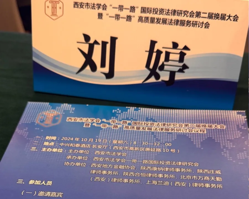2024年10月19日,西安市法学会“一带一路”国际投资法律研究会第二届换届大会暨“一带一路”高质量发展法律服务研讨会在西安成功召开。我所主任、高级合伙人刘婷律师当选新一届研究会常务理事。