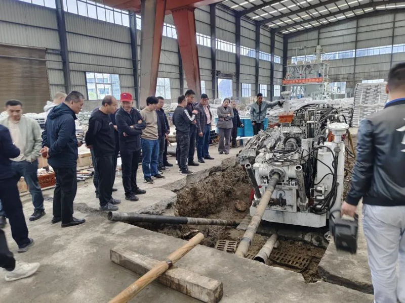 首先来到钻机试验场地,公司自主研发的ZYL-7000 S D(A)双管定向钻机正在进行试验,贵州东能客户近距离观看钻机,详细了解此款钻机具有同轴输出套管和钻杆的驱动力、自动上下套管钻杆、倾角调整和纵向横向锚固一体的功能,对钻机三种不同的钻井工艺等方面的卓越表现给予高度评价。