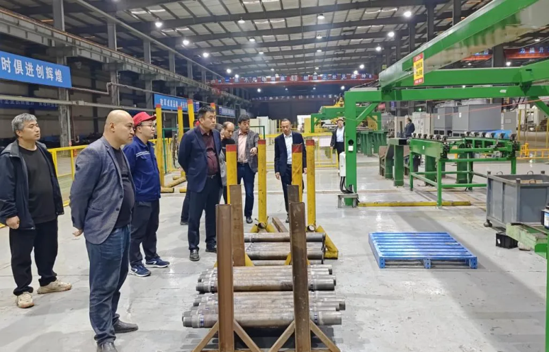 接着参观贵州太合生产车间,在生产线上工人师傅将钢管与制作完成的接头在数控车床处进行焊接至表面车平,之后便送至摩擦焊接机进行焊接,旁边的区域则是将焊接完成的部分进行淬火、回火,完成后又将其送入车床进行焊缝,最后通过数控螺旋铣床铣螺旋槽制成钻杆成品,送至成品堆放区。