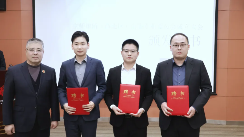 ▲吉雅主任为理事郭静(左二)、王堃(右二)、钮承雪(右一)颁发聘书