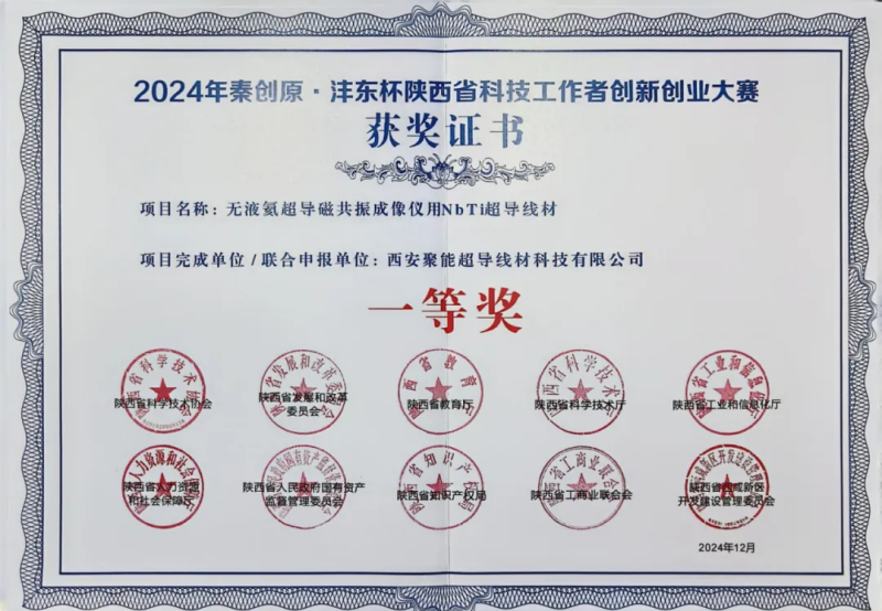 在西咸新区沣东新城举办的陕西省科技工作者创新创业大赛中,西部超导子公司西安聚能超导线材科技有限公司凭借“无液氦超导磁共振成像仪用NbTi超导线材”项目,荣获大赛一等奖!