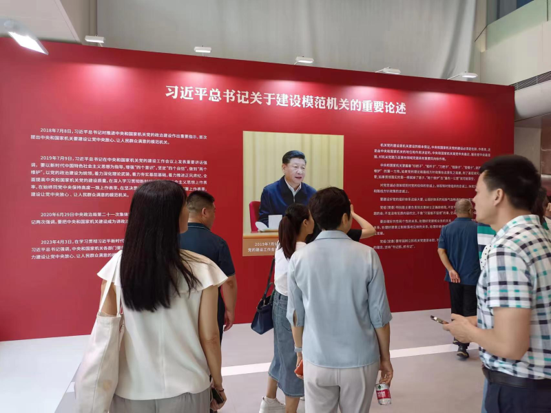 步入展区,首先映入眼帘的是“习近平总书记关于建设模范机关的重要论述”,令人精神振奋、备受鼓舞。随后,在讲解员的带领下,全体干部有序参观了“践行‘两个维护’、走好第一方阵”、“当好‘三个表率’、建设模范机关”、“彰显行业特色、联系服务群众”三大展区,通过大量详实的数据、生动的案例、纪实的图片和视频,系统阐述了习近平总书记关于党的建设的重要思想,全面呈现了省直机关学习贯彻习近平总书记“7·9”重要讲话精神的丰富实践和宝贵经验,让全体干部职工切实体会党建引领推进业务全面提升的强大力量。
