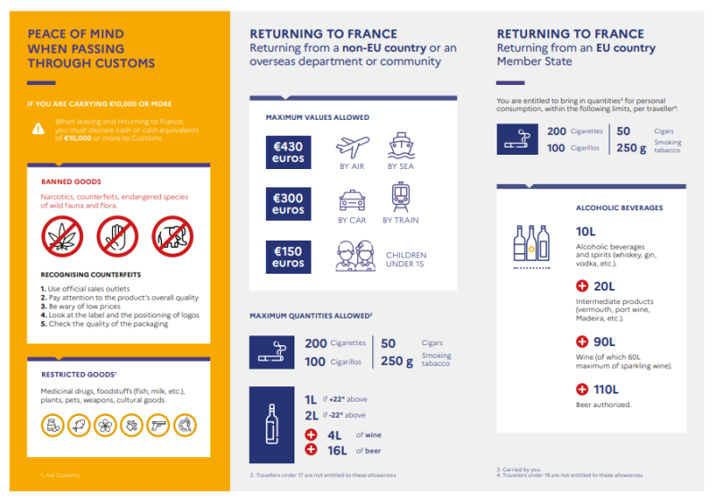 2多途径了解法国有关法律法规,特别是关于入出境携带物品种类和数量的规定(如香烟、药品、食品、液体、现金等,详见下图),请勿携带违禁品。