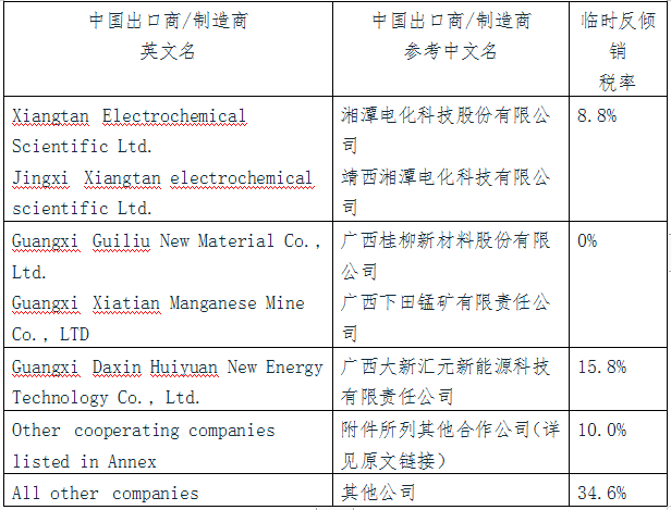 附表:欧盟对华电解二氧化锰产品反倾销初裁征税表