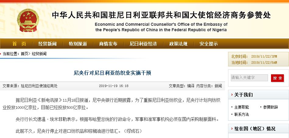 据尼日利亚《新电讯报》11月18日报道,尼日利亚央行对尼日利亚纺织业实施干预,尼央行计划向纺织业投放1000亿奈拉,目前已经投放500亿奈拉。根据布哈里总统的行政命令,军事和准军事机构必须在国内采购制服面料。