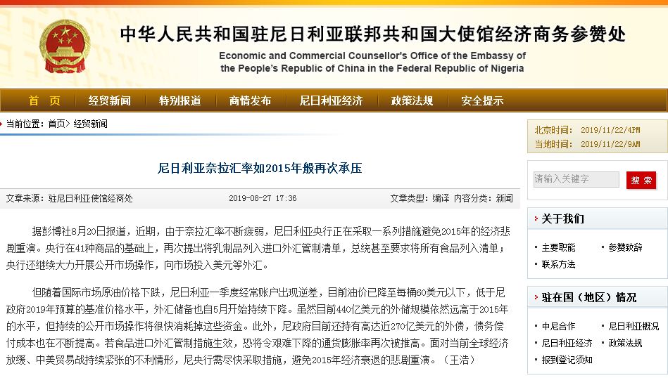 受此影响,我国对尼日利亚的出口业务可能出现回款速度减慢的问题,有的甚至无法收回货款。