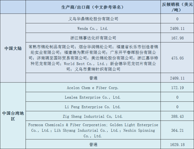12月23日,巴西外贸委员会发布决议称,对原产于中国大陆、中国台湾地区和韩国的尼龙线作出第一次反倾销日落复审肯定性终裁,决定继续对涉案产品征收反倾销税(详见下图),有效期为5年。涉案产品的南共市税号为5402.31.11、5402.31.19和5402.45.20。