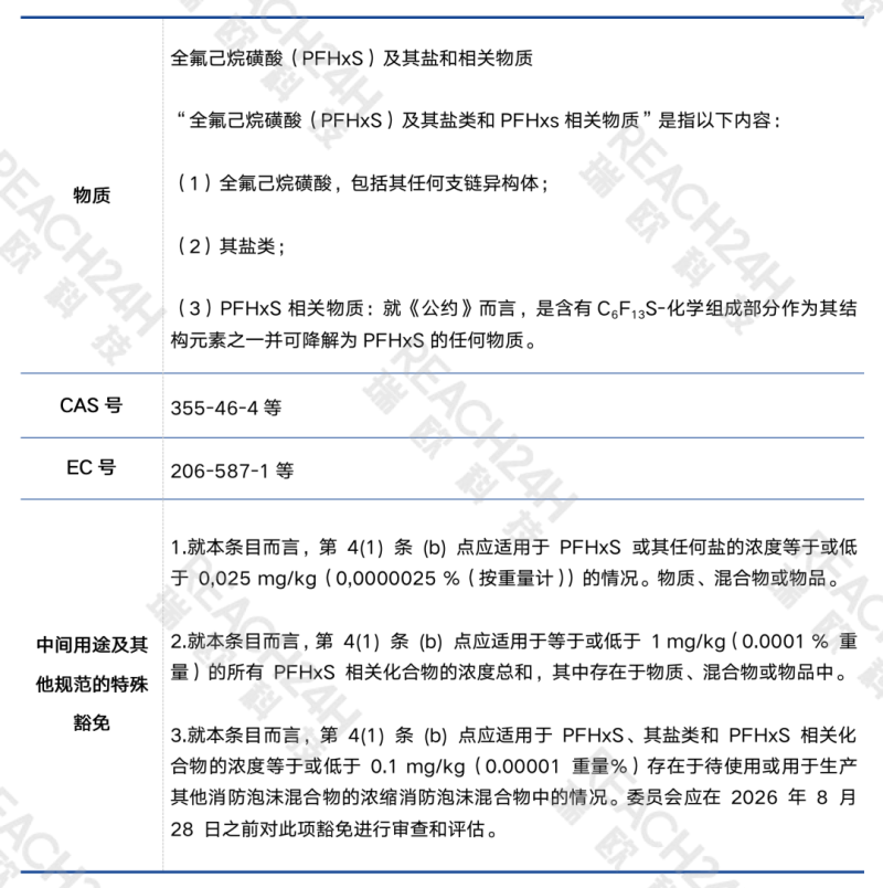 该条例将自公布后的第二十天起生效,其中对PFHxS及其盐类和相关物质的特定豁免如下: