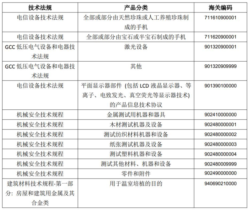 以下HS编码将于通知日期(2023年8月29日)起计30天内在Saber平台上更新,以符合相关技术法规: