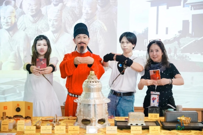 大唐贡茶(西安)有限公司、陕西秦岭四宝文旅有限公司、西安叁番集文创商务信息咨询有限公司、唐美人品牌运营管理有限公司等企业优选产品在世博会中国馆大放异彩,深受青睐。其中,大唐贡茶(西安)有限公司重点展示的唐代煮茶非遗技艺聚焦了众多目光。传承人以传统煮茶技艺为核心,全新设计编排唐代皇家宫廷茶道展演,复刻唐代皇家鎏金银茶器具,演绎了大唐皇宫的一场皇家茶宴席。传统煮茶技艺第七代传承人按照中国传统进行的授徒拜师仪式成为2025日本大阪世博会中国馆陕西周众多活动的亮点。同时,该传承人表示将在日本东京设立传统煮茶技艺传习点和展演点,将中国唐代的煮茶技艺传播到日本,实现传统煮茶非遗技艺的国际化传承。这将成为西安非遗走出国门,融入国际,开启全球传承的优秀范例。