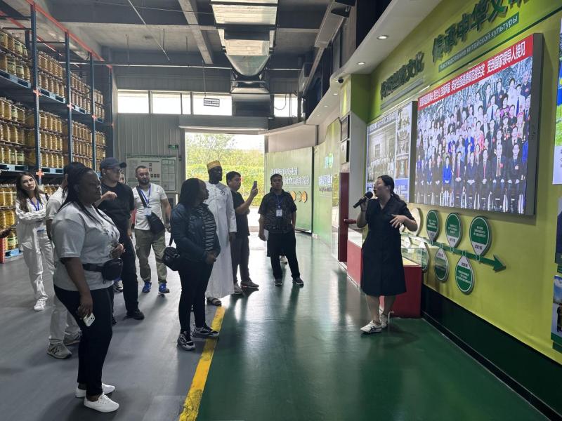 随后,代表团赴爱菊粮油工业集团考察。在讲解员的陪同下,代表团走进粮油加工车间,切身感受爱菊集团高效、清洁的智能生产工艺和严格的质量控制体系,深入了解爱菊集团企业发展史及中国粮油产业的发展历程,并对爱菊依托“一带一路”倡议,在哈萨克斯坦建立农产品种植基地、构建“北哈州—西安”国际粮食通道的建设成果表示赞叹。在爱粮节粮科普馆,通过图文展示、实物模型和互动体验,代表团系统了解中国粮食政策、储粮技术和节粮减损方面的举措与成效。在健康产品展示体验中心,代表团成员亲身体验“一站式”健康厨房消费场景,并对西安特色美食的风味与品质给予了高度评价。