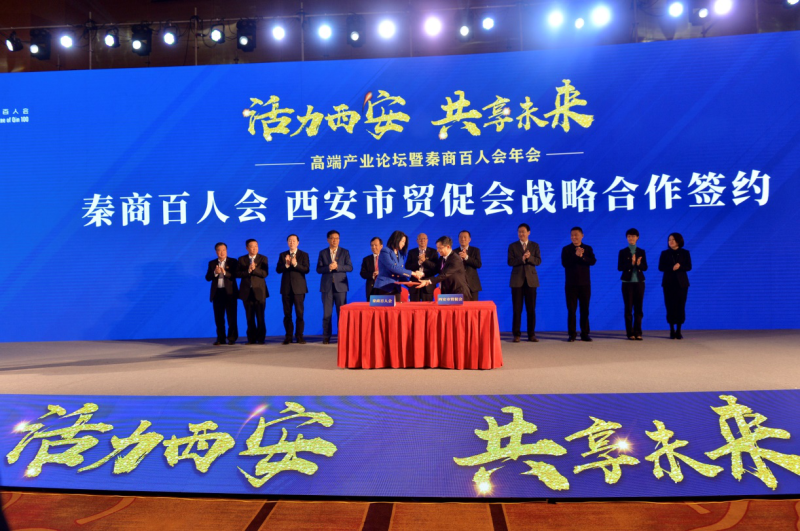 在此次会议上,西安市贸促会会长龙晓华与秦商百人会副主席孔东梅在市政府相关领导以及秦商百人会主席的见证下签署了战略合作协议书。双方同意:将秦商百人会高端论坛暨年会会址永久设在西安;围绕西安的重点发展产业和区县、开发区举办2+N项活动;共同打造全球秦商之家。