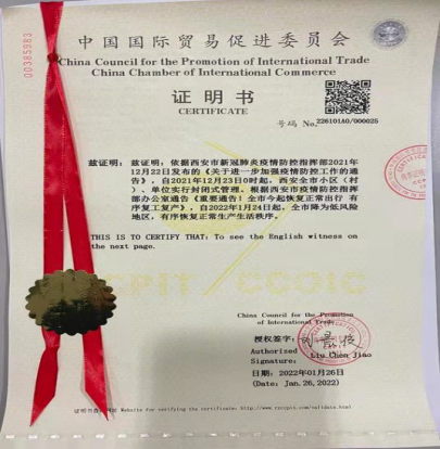 1月26日,市贸促会为西安科讯环保有限公司出具了首份“新冠肺炎疫情”不可抗力事实性证明书,涉及合同金额11万美元,帮助企业减免延期履约或不能履约的违约责任,为企业挽回受疫情影响造成的经济损失8000美元。西安科讯环保有限公司是一家环保设备的研发、生产企业,因疫情影响,不能按期履行合同。市贸促会获悉该公司情况后,立即通过电话和网络联系,详细告知企业申请流程和所需佐证材料。今日,经认证商事平台在线审核资料后,为其出具了疫情不可抗力事实性证明书。