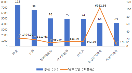 一季度,申办一般原产地证主要贸易国家为印度,共112份,贸易金额合计1494.99万美元;其次是伊朗,共98份,贸易金额合计1219.68万美元,共占第一季度办件量15.85%。申办量超过60份的国家沙特阿拉伯76份、俄罗斯联邦75份、土耳其74份、乌兹别克斯坦64份,哈萨克斯坦63份。以上五个国家办件总量占第一季度办件量25% 。