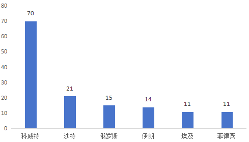 商事证明书办理企业的消费国主要为科威特和沙特阿拉伯,合计91份,占比超过45.04%;其次为俄罗斯、伊朗,占比为14.36%