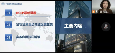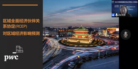 培训会上,中国贸促会商事认证中心FTA专班执行组长孙婷婷介绍了RCEP最新进展、货物贸易重点领域优惠政策,并重点介绍有关RCEP实务应用技巧解读。普华永道西安事务所专家赵鸿主要从存量商贸变化趋势、增量商贸机遇和挑战、区域经济发展的积极影响三个方面对RCEP对区域经济影响预测的相关内容进行了精彩的讲解。