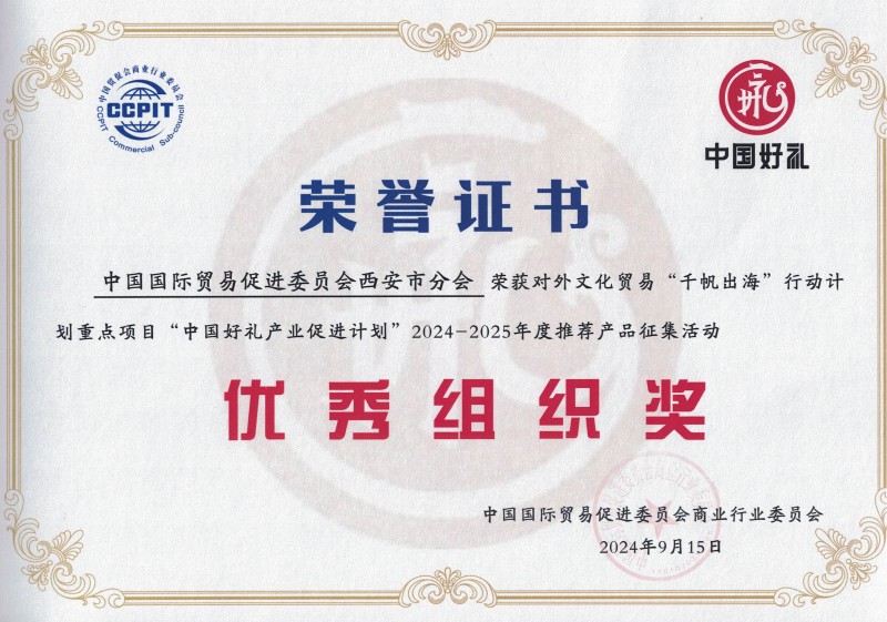 在西安市贸促会的积极协调下,西安地区众多具有创新表现、蕴含中国文化丰富内涵的产品脱颖而出,其中包括西安冰峰饮科股份有限公司的冰峰橙味汽水,陕西华夏文化创意有限责任公司的葡萄花鸟纹香囊,西安观途文化旅游发展有限公司的雁塔题名光影花灯,西安东方传奇文化创意产业投资发展有限公司的释渡-众行戒指等21家企业35件产品最终入选《中国好礼产业促进计划2024-2025年度推荐产品名录》。西安市贸促会也因此荣获由中国贸促会商业行业委员会颁发的优秀组织奖。